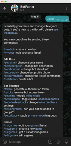 - 与BotFather开始聊天,输入‘/newbot’并发送。