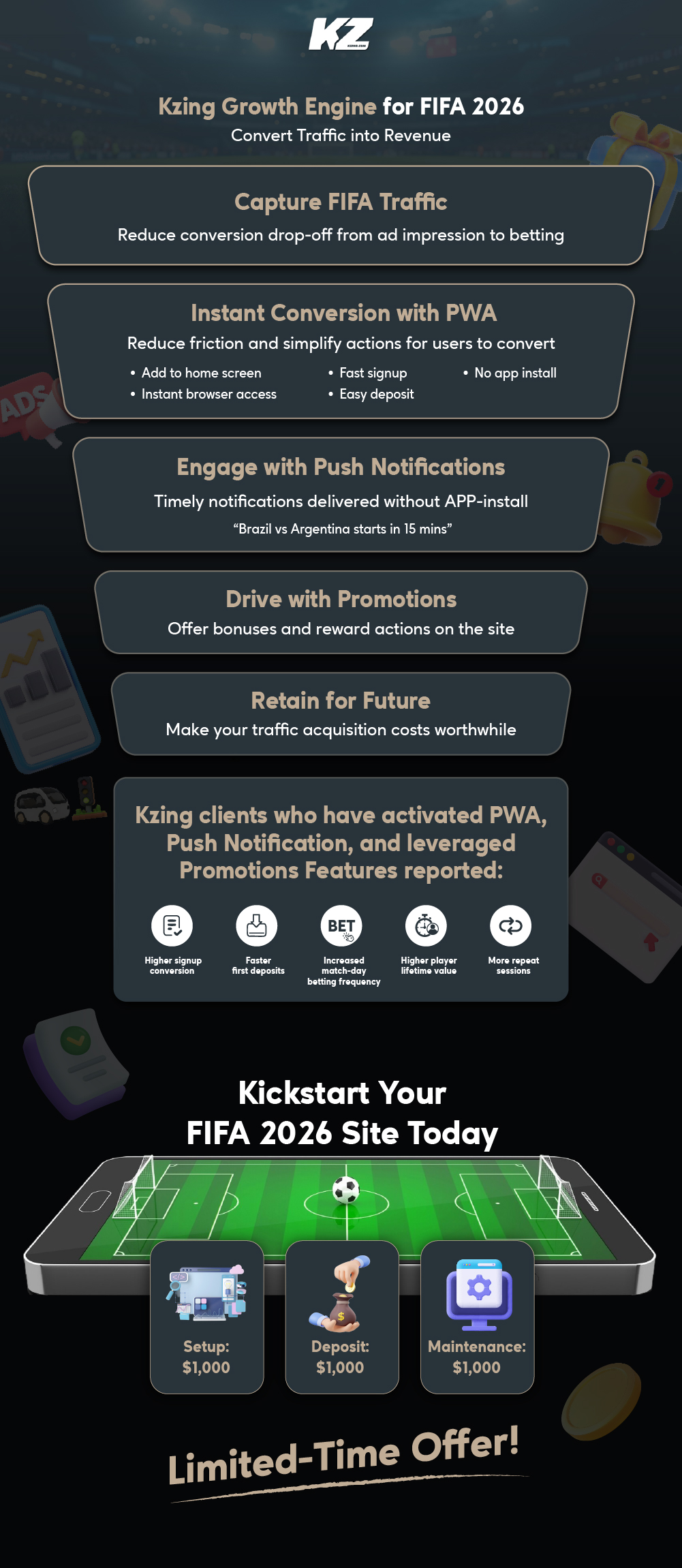 With Kzing’s Growth Engine powered by PWA, push notifications, and promotions, you can launch a conversion-optimized platform within days and maximize every traffic opportunity from kickoff to final whistle.